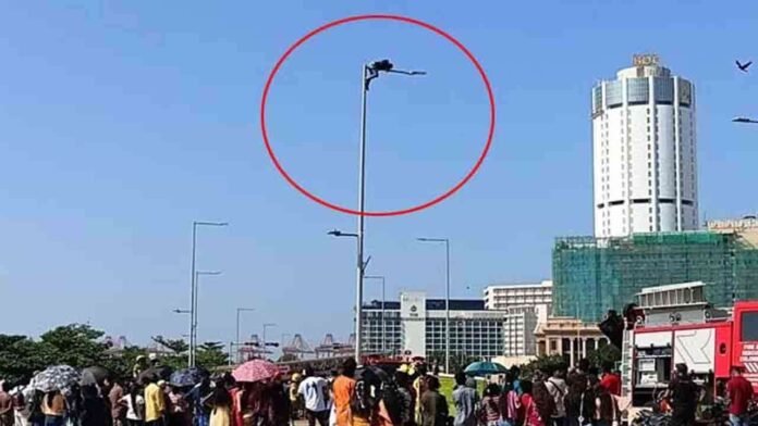 காலி முகத்திடலில் உள்ள மின்கம்பமொன்றின் உச்சியில் ஏறி போராட்டத்தில் ஈடுபட்ட நபர்.!