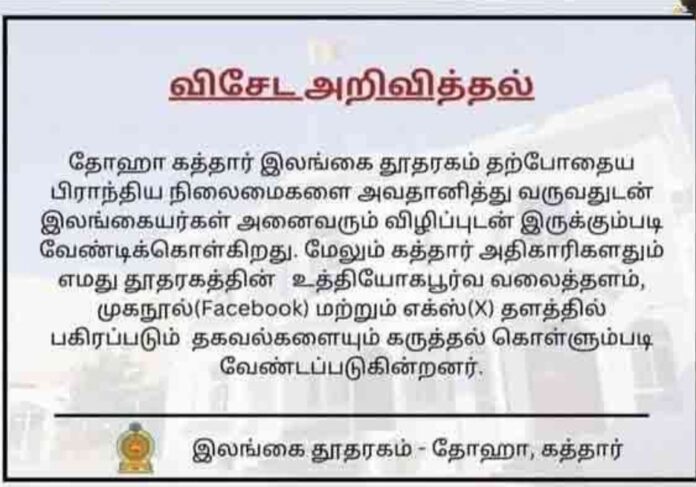By: News Desk Date: February 28, 2026 தோஹா, கட்டார் விசேட அறிவிப்பு மத்திய கிழக்கு நாடுகளில் ஏற்பட்டுள்ள போர் பதற்றத்தை அடுத்து தோஹா, கட்டாரில் இருக்கும் இலங்கையர்களுக்கு விசேட அறிவித்தல் விடுக்கப்பட்டுள்ளது.. Previous articleநாட்டின் எரிபொருள் விநியோகத்தில் சிக்கல்??Next article#BREAKING | குவைத் விமான நிலையத்தில் ஈரான் தாக்குதல்! #TamilNews | #Iran | #KuwaitAirport | #Israel LEAVE A REPLY Cancel reply Comment: Please enter your comment! Name:* Please enter your name here Email:* You have entered an incorrect email address! Please enter your email address here Website: Save my name, email, and website in this browser for the next time I comment. மள்வானை ரக்ஷபான ஜும்ஆ மஸ்ஜிதில் நடைபெற்ற தேசிய மிஹ்ராஜ் தின விசேட நிகழ்வு..!03:03 நீரில் மூழ்கி போன சம்மாந்துறை - அம்பாறை வீதி..!04:10 முஸ்லிம் சேவையா? விளம்பர சேவையா? முஸ்லிம் சேவையின் எதிர்காலம் என்ன?06:43 முஸ்லிம் நிகழ்ச்சியில் அதிகரித்த விளம்பரங்கள்! | பாராளுமன்றம் வரை சென்ற பிரச்சனை!06:43 அல்ஹம்து சூரா ஓதி -அரசுக்கு எதிரான நுகேகொடை பேரணி..! ஆயிரக்கணக்கான மக்கள் மத்தியில் மௌலவியின் ஆதங்க 02:52 தெற்கு அதிவேக வீதியில் நுழைந்து அட்டகாசம் செய்த காட்டு யானை!01:52 Share post: FacebookTwitterPinterestWhatsApp Popular Breaking சற்றுமுன் அதிகரித்த எரிபொருள் விலை #BREAKING | குவைத் விமான நிலையத்தில் ஈரான் தாக்குதல்! #TamilNews | #Iran | #KuwaitAirport | #Israel நாட்டின் எரிபொருள் விநியோகத்தில் சிக்கல்?? அம்பாறையில் திடீரென உருவானது எரிபொருள் வரிசை… Breaking சவூதி வாழ் இலங்கையர்களுக்கு தூதரகம் அவசர எச்சரிக்கை! More like thisRelated Breaking சற்றுமுன் அதிகரித்த எரிபொருள் விலை News Desk - February 28, 2026 மாதாந்த எரிபொருள் விலை திருத்தத்திற்கு ஏற்ப இன்று (28) மேற்கொள்ள திட்டமிடப்பட்டுள்ள... #BREAKING | குவைத் விமான நிலையத்தில் ஈரான் தாக்குதல்! #TamilNews | #Iran | #KuwaitAirport | #Israel News Desk - February 28, 2026 குவைத் விமான நிலையத்தில் ஈரான் தாக்குதல்... நாட்டின் எரிபொருள் விநியோகத்தில் சிக்கல்?? News Desk - February 28, 2026 மத்திய கிழக்கில் நிலவும் போர் சூழல் காரணமாக நாட்டில் எரிபொருள் தட்டுப்பாடு... அம்பாறையில் திடீரென உருவானது எரிபொருள் வரிசை… News Desk - February 28, 2026 அம்பாறையில் திடீரென உருவானது எரிபொருள் வரிசை... மத்திய கிழக்கில் பதற்றம் என்பதால் எரிபொருள்...