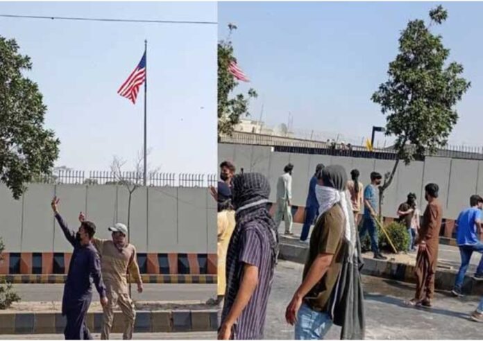 எம்.டி. கான் வீதியில் (MT Khan Road) உள்ள தூதரகத்திற்கு வெளியே திரண்ட நூற்றுக்கணக்கான ஆர்ப்பாட்டக்காரர்கள், தூதரக வளாகத்திற்குள் நுழைய முற்பட்டதுடன் கற்களை வீசித் தாக்குதல் நடத்தினர். நிலைமையைக் கட்டுப்படுத்த பொலிஸாரும் துணை இராணுவப் படையினரும் கண்ணீர் புகைக் குண்டுகளை வீசியதுடன், தடியடி நடத்தியும் ஆர்ப்பாட்டக்காரர்களைக் கலைக்க முயன்றுள்ளனர்.