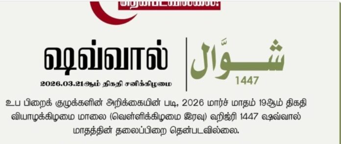 உப பிறைக் குழுக்களின் அறிக்கையின்படி 2026 மார்ச் மாதம் 19 ஆம் திகதி வியாழக்கிழமை மாலை ஹிஜ்ரி 1447 ஷவ்வால் மாதத்தின் தலைப்பிறை தென்படவில்லை.
