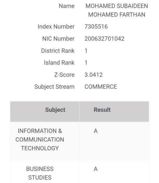 தகவல் மற்றும் தொடர்பாடல் தொழில்நுட்பம், வணிகக் கல்வி, கணக்கியல் ஆகிய மூன்று பாடங்களிலும் ‘A’ சித்தி பெற்ற இவர், 3.0412 Z-Score புள்ளிகளுடன் இந்த உயரிய மைல்கல்லை எட்டியுள்ளார். இம்மாணவனின் அபார சாதனையைக் காத்தான்குடி மக்களும், கல்விச் சமூகமும் கொண்டாடி வருகின்றனர்.